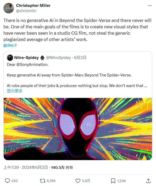 《蜘蛛俠:縱橫宇宙》官方回應:“絕不在電影中加入AI內容”