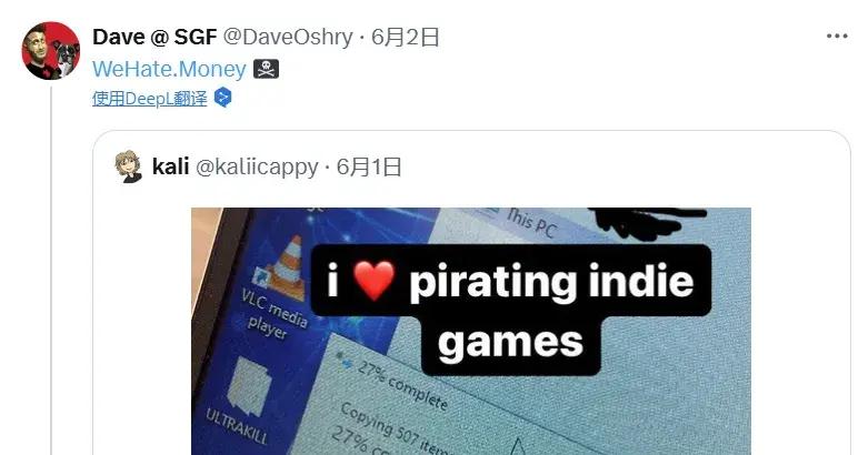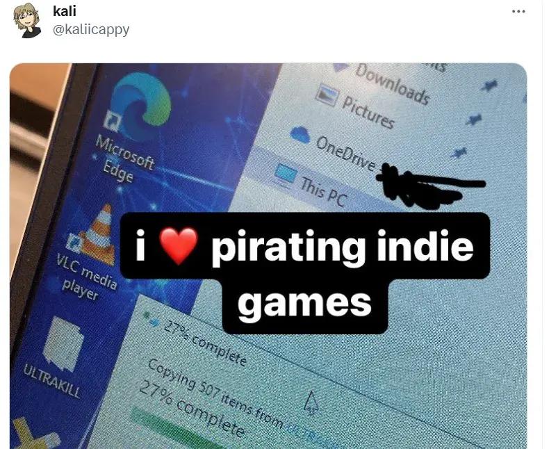 kali是推特上的一名普通網友,平日裏她喜歡通過推特分享一些生活趣事和遊戲內容。6月1日的時候,kali發佈了一條推文,並配圖“我愛盜版獨立遊戲”,而她正在拷貝的遊戲文件,正是2020年發售的好評如潮的復古FPS遊戲《ULTRAKILL》。