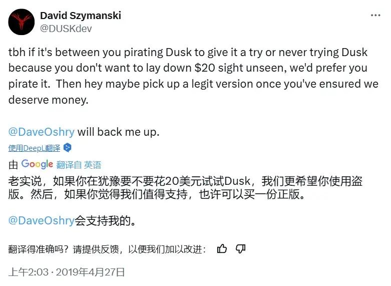 或許有人會覺得,《ULTRAKILL》是一款口碑銷量雙豐收的熱門遊戲,兼顧開發和發行的New Blood肯定也不缺這幾份盜版的收入 。但早在2019年,《ULTRAKILL》尚未發售,New Blood的收入也不及今天這般時,他們的員工就已經在慫恿大家玩盜版了,這位叫做David Szymanski的開發者甚至還在宣傳盜版的推文下面@了老闆Dave Oshry,不難看出New Blood公司內部對待盜版的態度的確十分隨意。