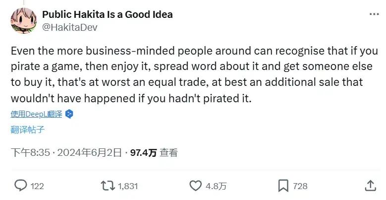 隨後,Hakita也在商業層面針對盜版發表了一些個人見解:“即便是那些更加註重商業利益的人也能認識到,如果你玩了一款盜版遊戲,非常喜歡,然後推薦給了其他人,而其他人購買了正版,那麼最壞的情況這也是一筆平等的交易,最好的情況則是一次額外的銷售,如果沒有盜版遊戲的話,這種情況根本就不會發生。”