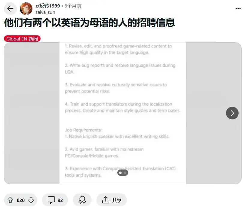 《重返未來:1999》的敘事風格確實不好翻,閱讀門檻也比較高。這之後深藍互動老老實實招了英文本地化成員,不少海外玩家還在招聘信息下面躍躍欲試,至於現在,遊戲的英語文本質量之高,已經開始讓一些玩家懷疑遊戲文案是不是以英文母語者爲主了。