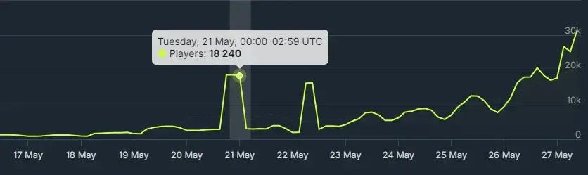 這款遊戲既沒有文字說明,也沒有最終目標,當然更難有任何能夠稱得上是正反饋的東西,但就是這樣一款看似粗製濫造的東西,不僅在Steam上收穫到了“特別好評”,而且從5月下旬開始,它的在線人數就一直穩步攀升,如今甚至挺進了在線榜前十。