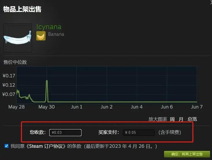 目前一根賣方售價0.03元的香蕉,在Steam市場上的價格要被標到0.05元,看似只多了兩分錢,但相對售價來說,漲幅已經達到了66.7%,而這種最廉價的香蕉,其存貨量和交易量往往也是最大的: