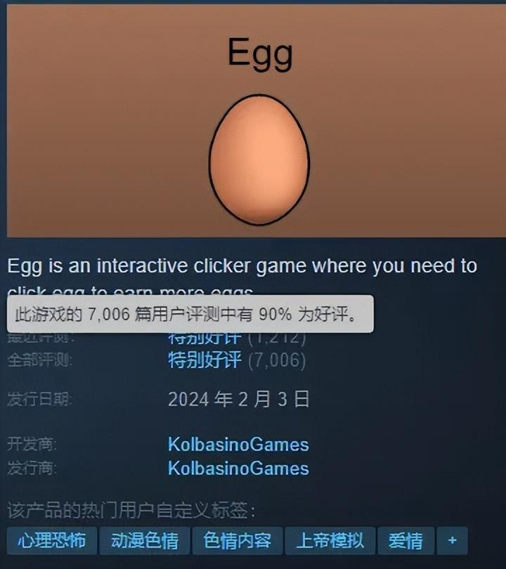 比如今年2月推出的《Egg》,同樣是毫無內容的點擊遊戲,同樣憑藉掉落的“虛擬雞蛋”,依靠二手交易市場的“場外玩法”,在Steam上得到了90%的好評率: