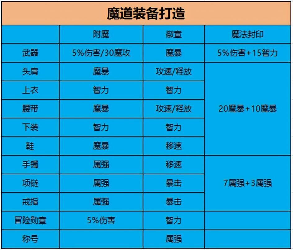 「裝備徽章」“武器”推薦魔暴,“上衣+下裝+冒險勳章”推薦智力;“頭肩+腰帶”推薦攻速/釋放;