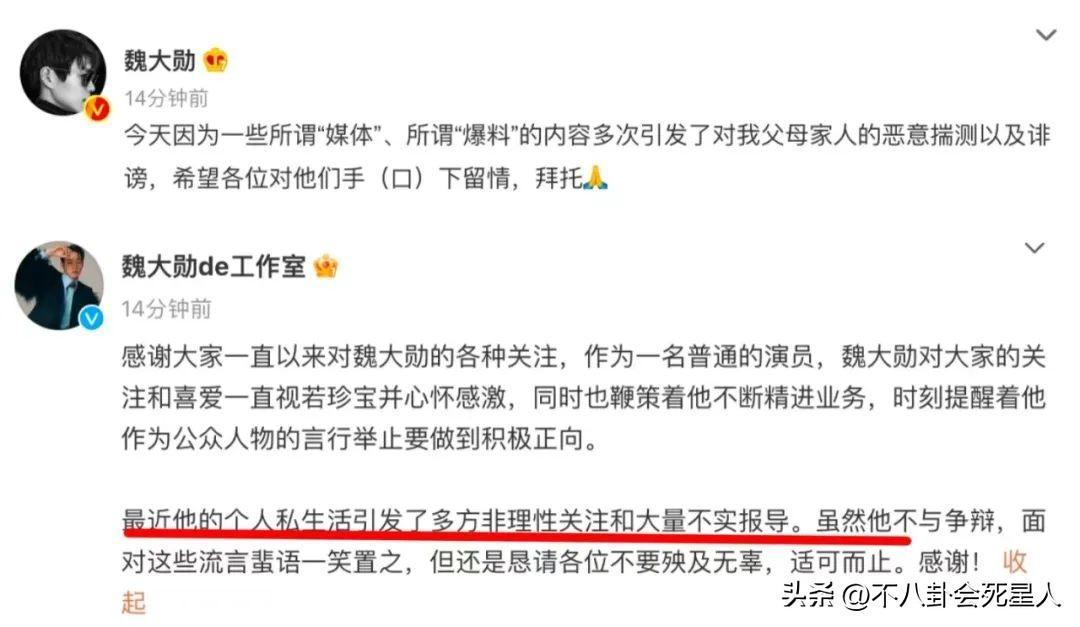 當時,雙方就被猜測已經分了,但是沒過多久,魏大勳及其工作室發文,稱網上有許多不實報導,所以真假難辨。