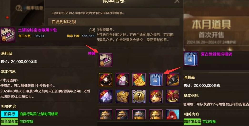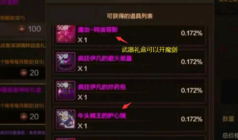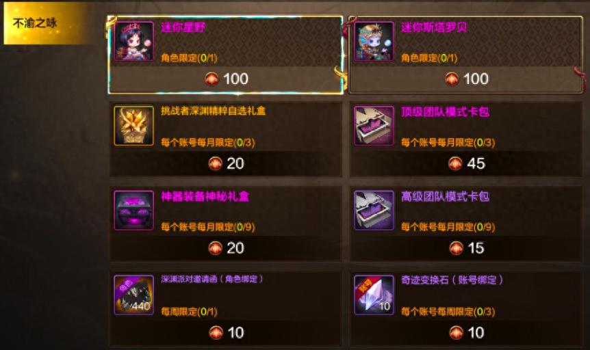 比如寵物、團隊卡包、神器裝備禮盒、深淵門票、奇蹟變換石等。