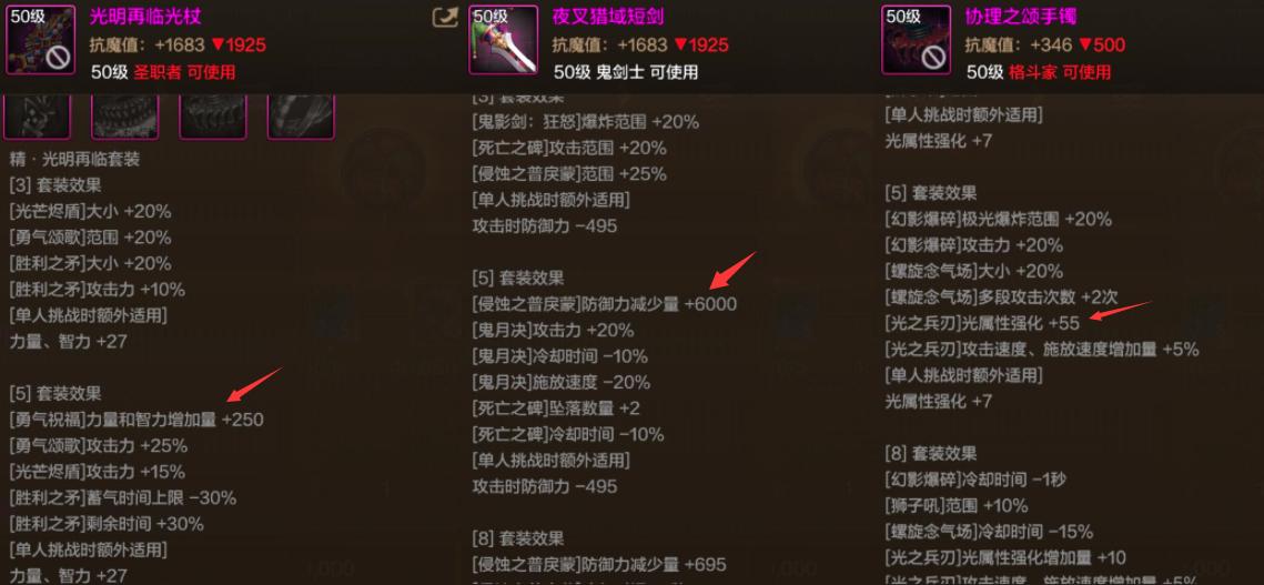 升級後屬性提升更好,比如氣功5件套從50光屬強增加到55光屬強;