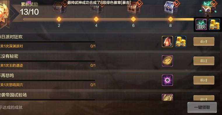 “每日成就”和“決鬥場任務”都比較推薦,因爲它們不僅能帶來大量金幣,還能獲得泰拉、鑰匙、深淵票等等,屬於每天必打的任務。