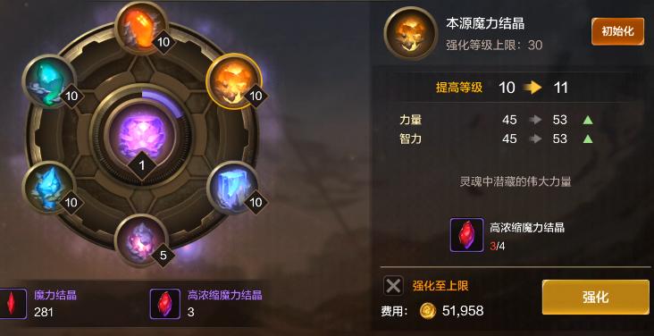 魔力強化能夠帶來大量的屬性提升,同時也會消耗大量魔力結晶和金幣,優先推薦“力智”和“暴擊”。
