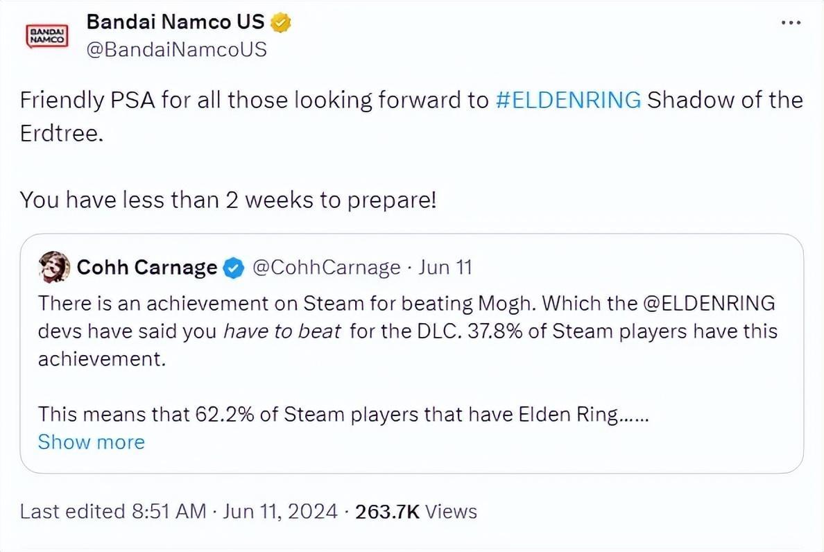 這樣的條件不僅引發了一部分玩家的抱怨,似乎也讓發行方萬代南夢宮有些擔憂,通過官推打“預防針”,反覆提醒玩家們儘量預留一個好存檔,保證DLC發售時達到“准入條件”。