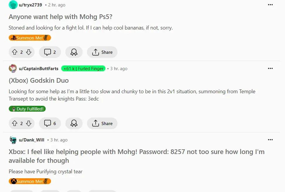 在Reddit的《黃金樹幽影》板塊上,隨處可見針對蒙格的求助和提供幫助的玩家請求。資深褪色者們則早已行動了起來,各個平臺都有玩家主動幫忙,他們突出一個人狠話不多,扔下一個召喚密碼,方便其他玩家精準召喚。