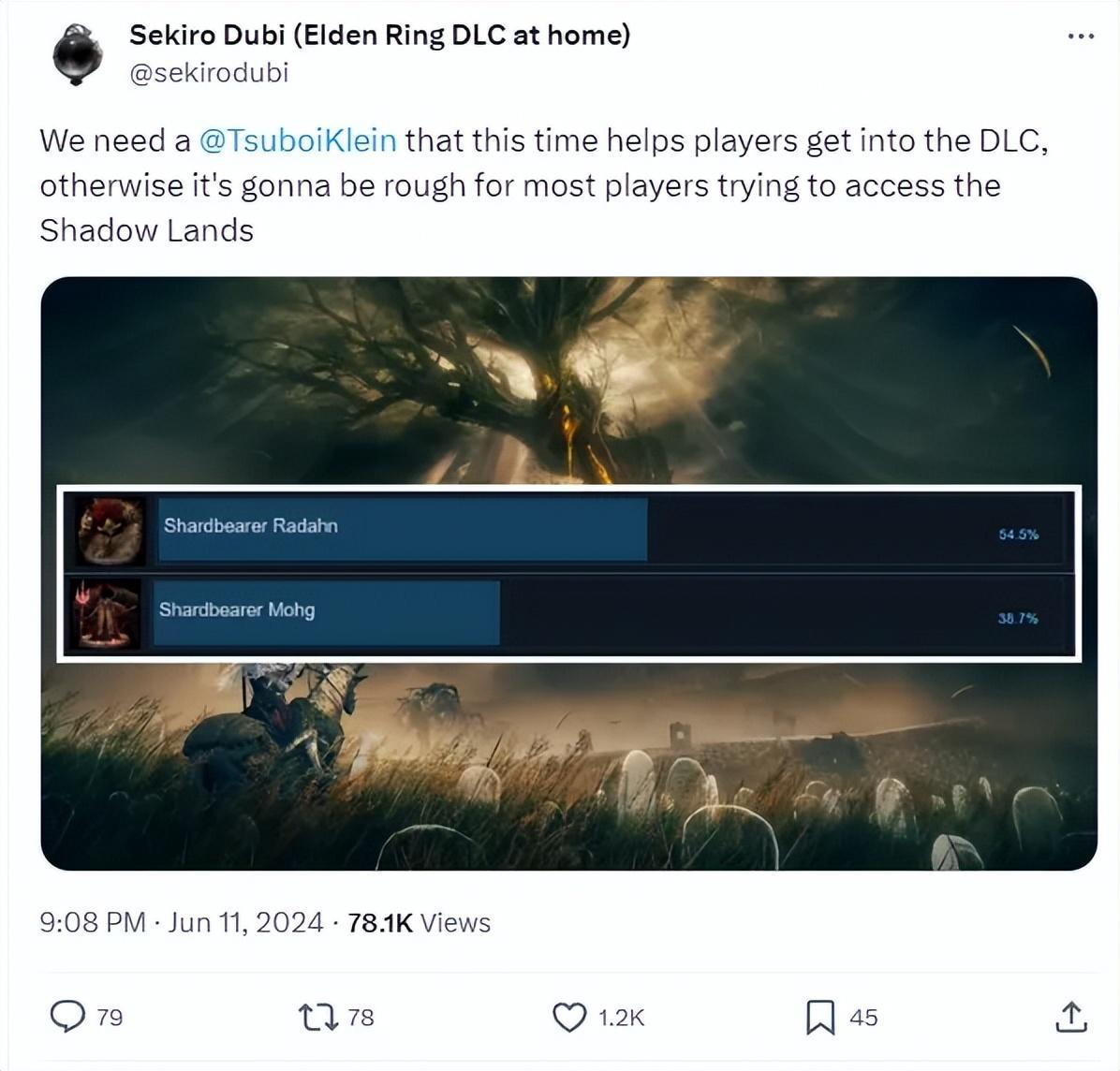 與此同時,玩家們也沒閒着,最近一些海外社區已經開始號召互相幫助,學習當年“Let Me Solo Her”主角壺哥替人單刷瑪蓮妮亞的精神,幫助更多的褪色者至少打敗這兩個BOSS,放心進入新世界。