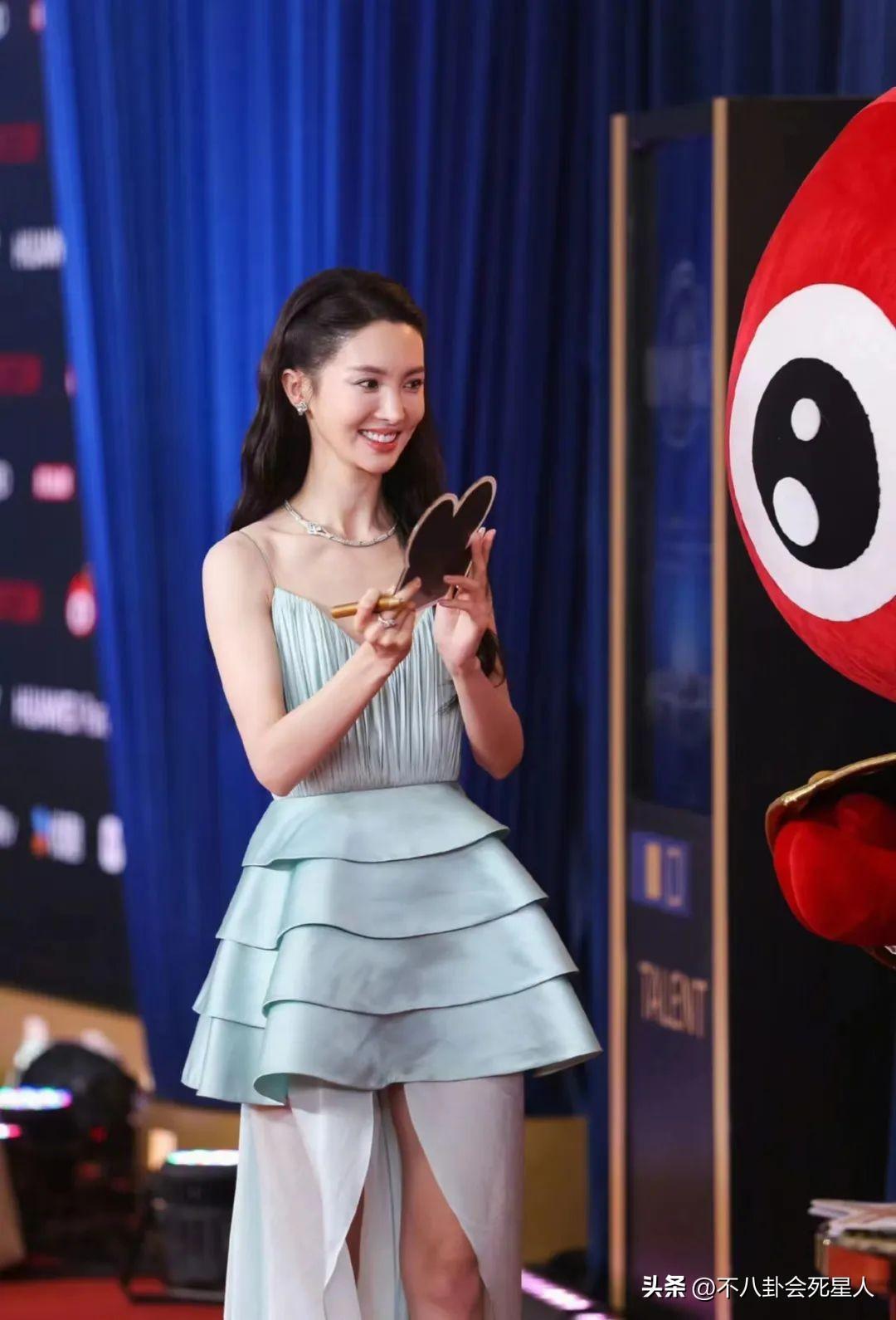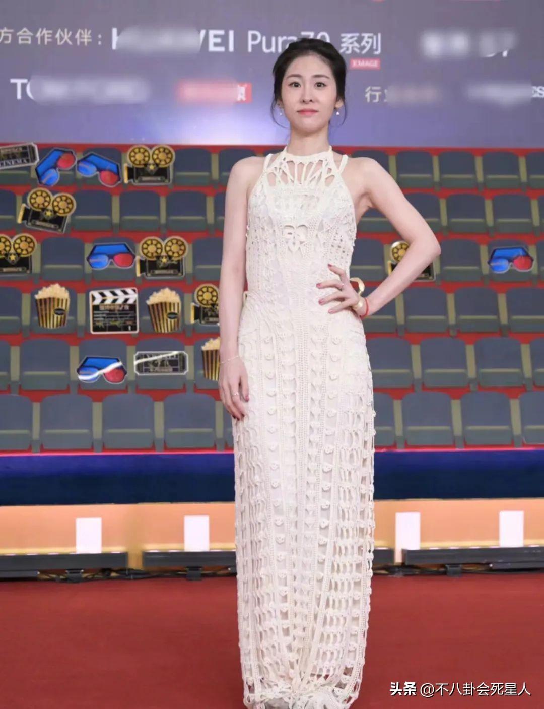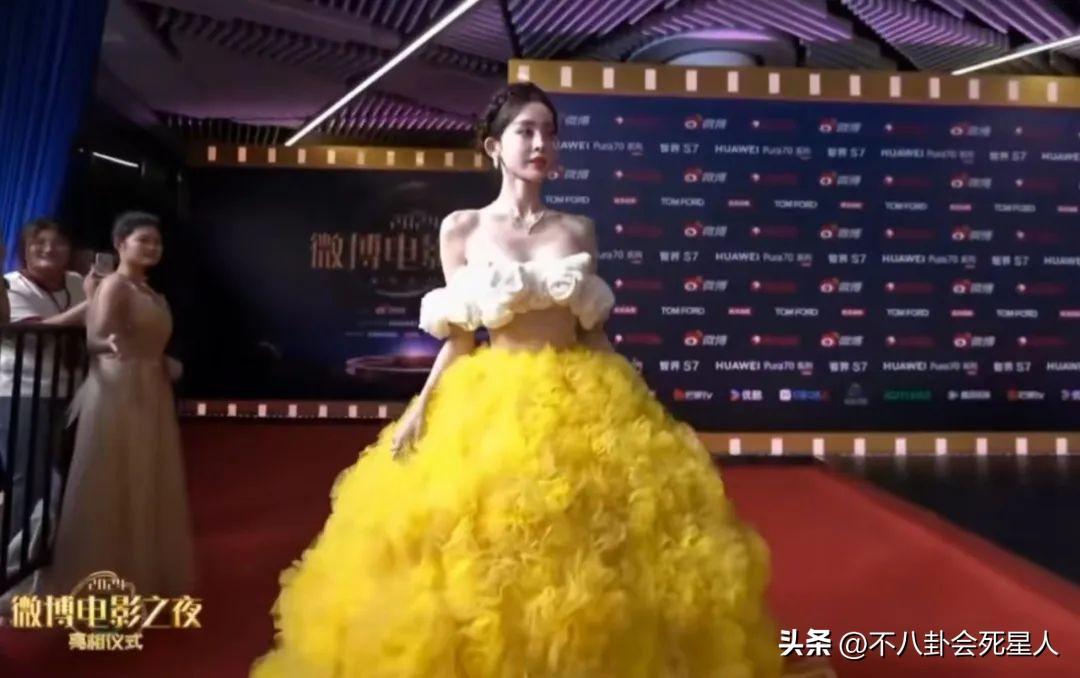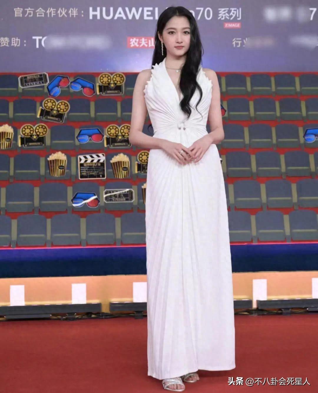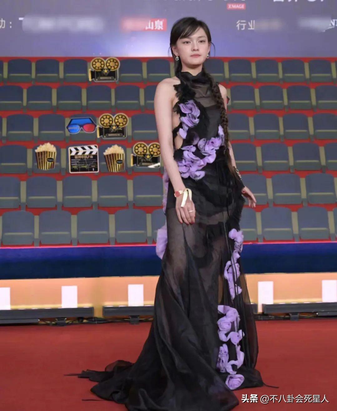 同樣留着波浪髮型的還有周也,她化身“孔雀公主”,穿着抹胸禮服亮相紅毯,因爲身材太瘦有些撐不起禮服,周也走路經常提着裙子以防走光。