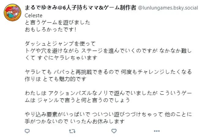 雪見認爲,像《蔚藍》這樣無論死多少次都能繼續挑戰的遊戲,非常富有魅力