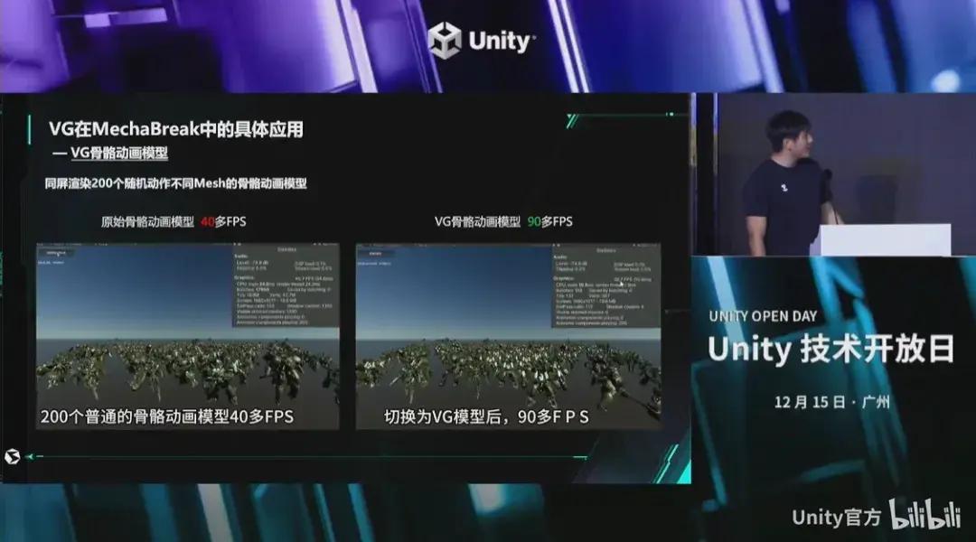 在2023年Unity技術開放日上,西山居進一步展示了VG技術其背後的潛力,比如在地圖上佈滿高精度的樹木建模,同屏理論三角面達到上億;或是渲染超過200臺動作和型號各不相同的機體時,使用VG技術從40 FPS提升至90 FPS。根據西山居提供的數據,更換至VG場景後,使用顯卡3080的超高畫質機型FPS提升了47幀,而在使用960的低畫質機型,也能從51幀提升至67幀。