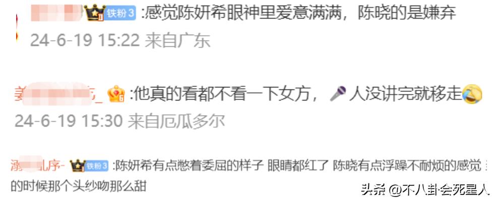 但陳曉全程沒有轉過頭看一眼陳妍希,身體也沒有往妻子的方向靠,並且對比起陳妍希的甜笑,陳曉全程表情冷淡,看不出一點笑容,反而是不停眨眼,有種心不在焉的感覺。
