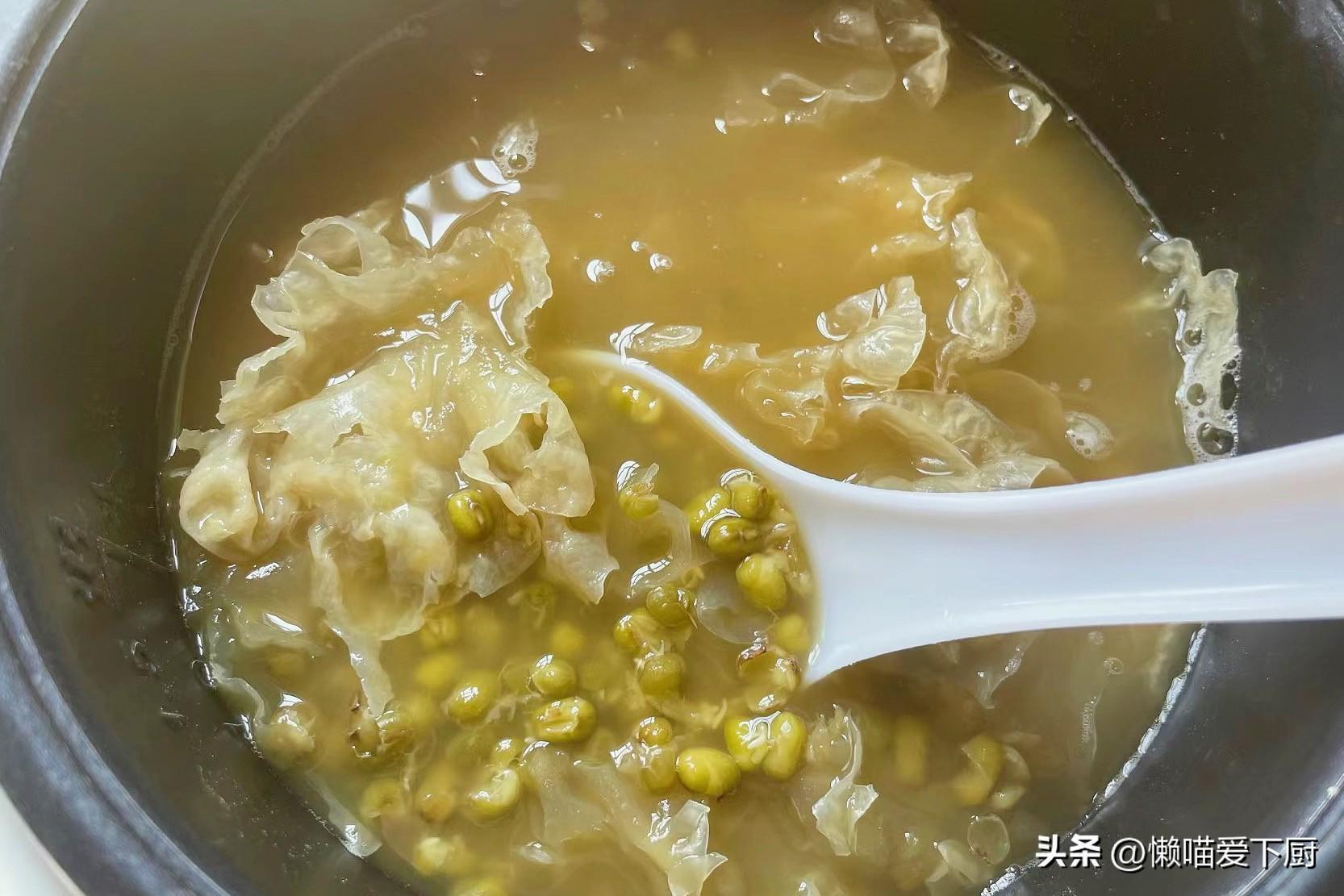 銀耳提前泡軟,剪掉黃色的根部,洗淨後用手撕成小片狀,和綠豆(建議提前泡2個小時)一起下入鍋中,加足量熱水,大火煮開後轉小火熬煮30分鐘左右,煮至銀耳出膠後放入冰糖,再煮5分鐘後關火。