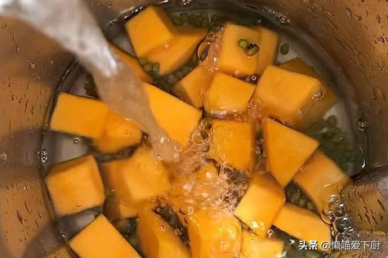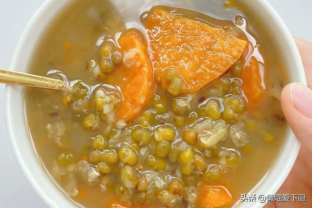 綠豆提前浸泡2個小時,番薯削皮後切成滾刀塊,然後將它們一起倒入鍋中,加足量清水,大火煮開後轉小火熬煮30分鐘,出鍋前5分鐘加入冰糖,熬煮至冰糖完全溶解,就可以盛出鍋享用了。