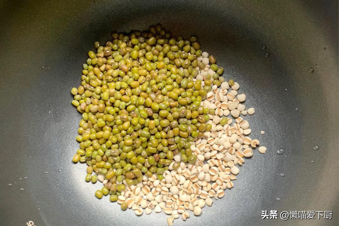 生薏米先下入鍋中,小火幹炒至表面變焦黃,然後再和綠豆一起倒入湯鍋中,加足量清水,大火煮開後轉小火煮20分鐘,取煮出來的湯水喝即可,如果想喫豆子,煮的時間可以延長一些,將豆子煮爛。
