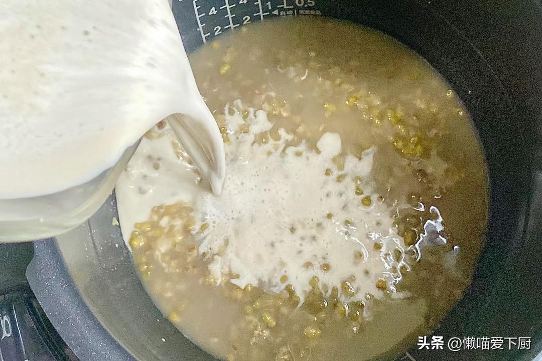 綠豆提前泡軟,再加入湯鍋中,加適量熱水,大火煮開轉小火煮30分鐘,煮至鍋中豆子開花後,關火燜30分鐘,等綠豆湯變溫一些後,倒入純牛奶,攪拌均勻後,就可以享用了,是一道不錯的夏季甜品。
