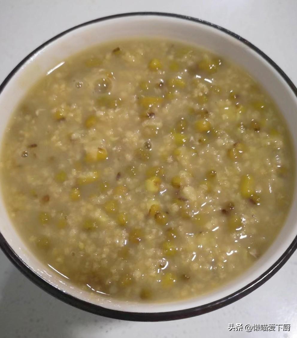 綠豆、小米按1:1的比例準備好,綠豆建議提前用清水泡2個小時,然後將它們一起加入鍋中,按照平時煮粥的方式開煮,煮至所有食材變成粥狀後,就可以盛碗享用了。
