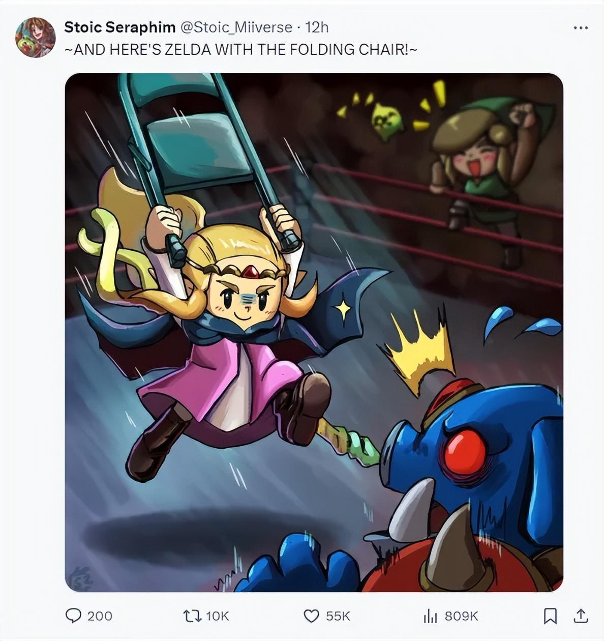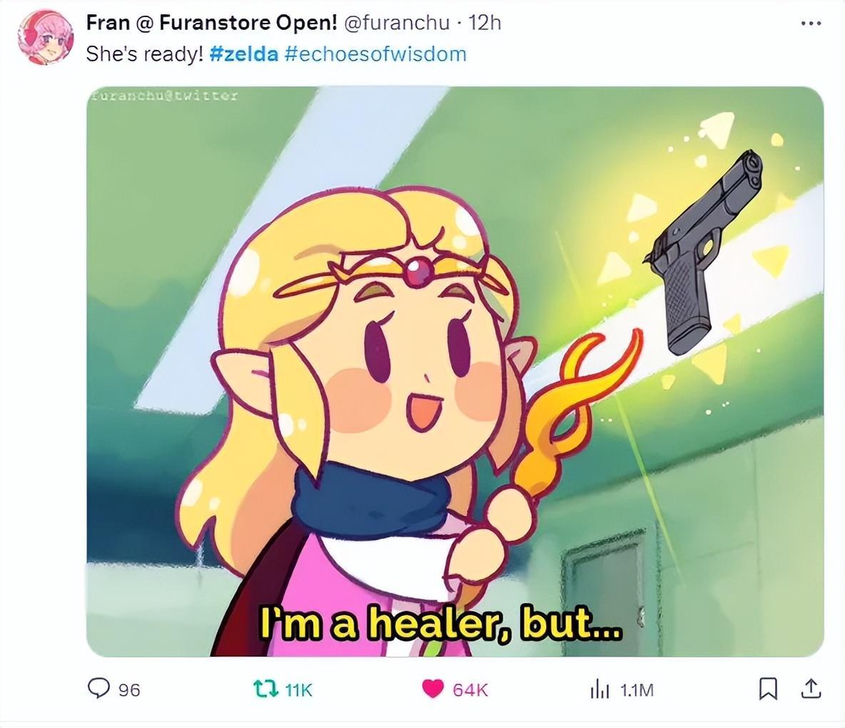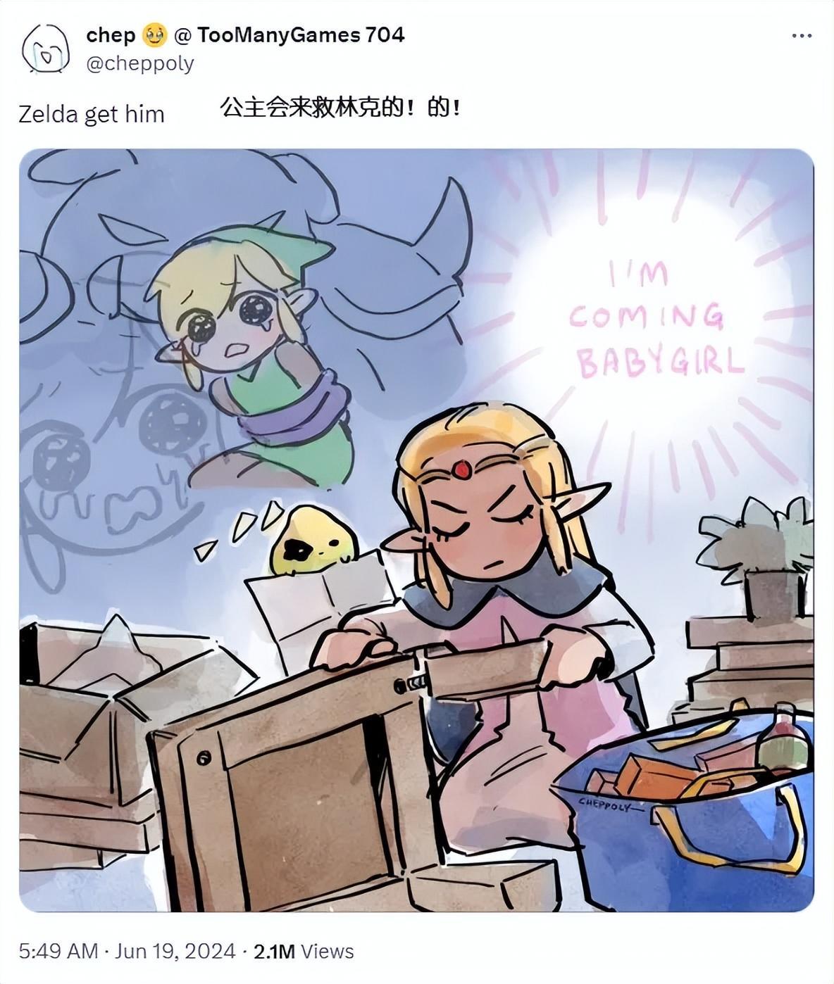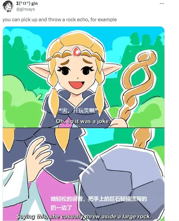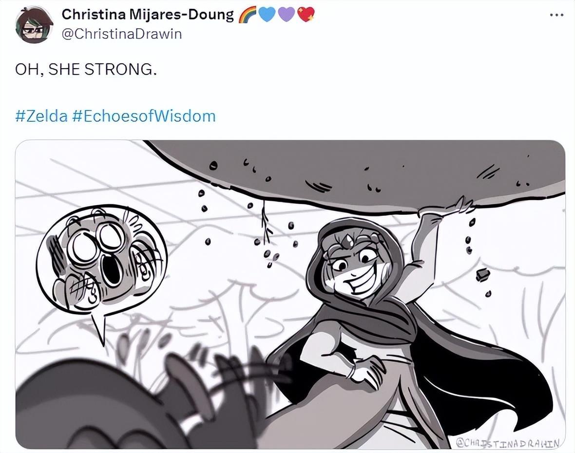 對比以往作品中塞爾達相對柔弱的形象,這頗有種“男朋友在的時候擰不開瓶蓋,男朋友不在能擰開天靈蓋”的反差感,自然也成爲了熱門的二創題材。
