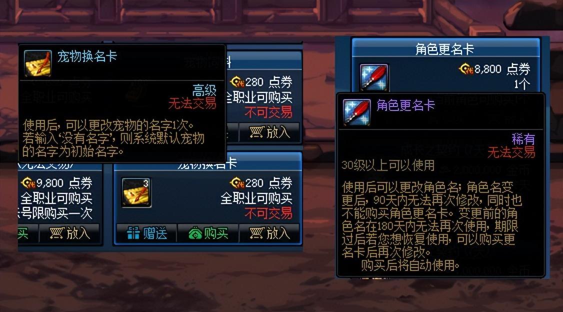 寵物改名卡280代幣券3張,角色改名卡8800代幣券1張,而且每個角色只能購買1次。