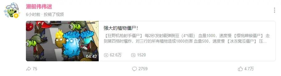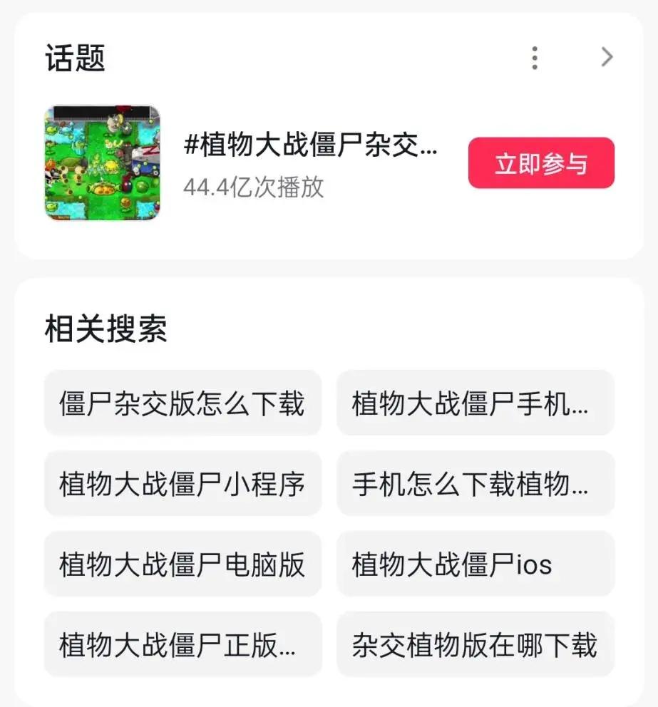 另一邊的抖音平臺,標有#植物大戰殭屍雜交版#的視頻播放量超過44億,全國人口數量的三倍。
