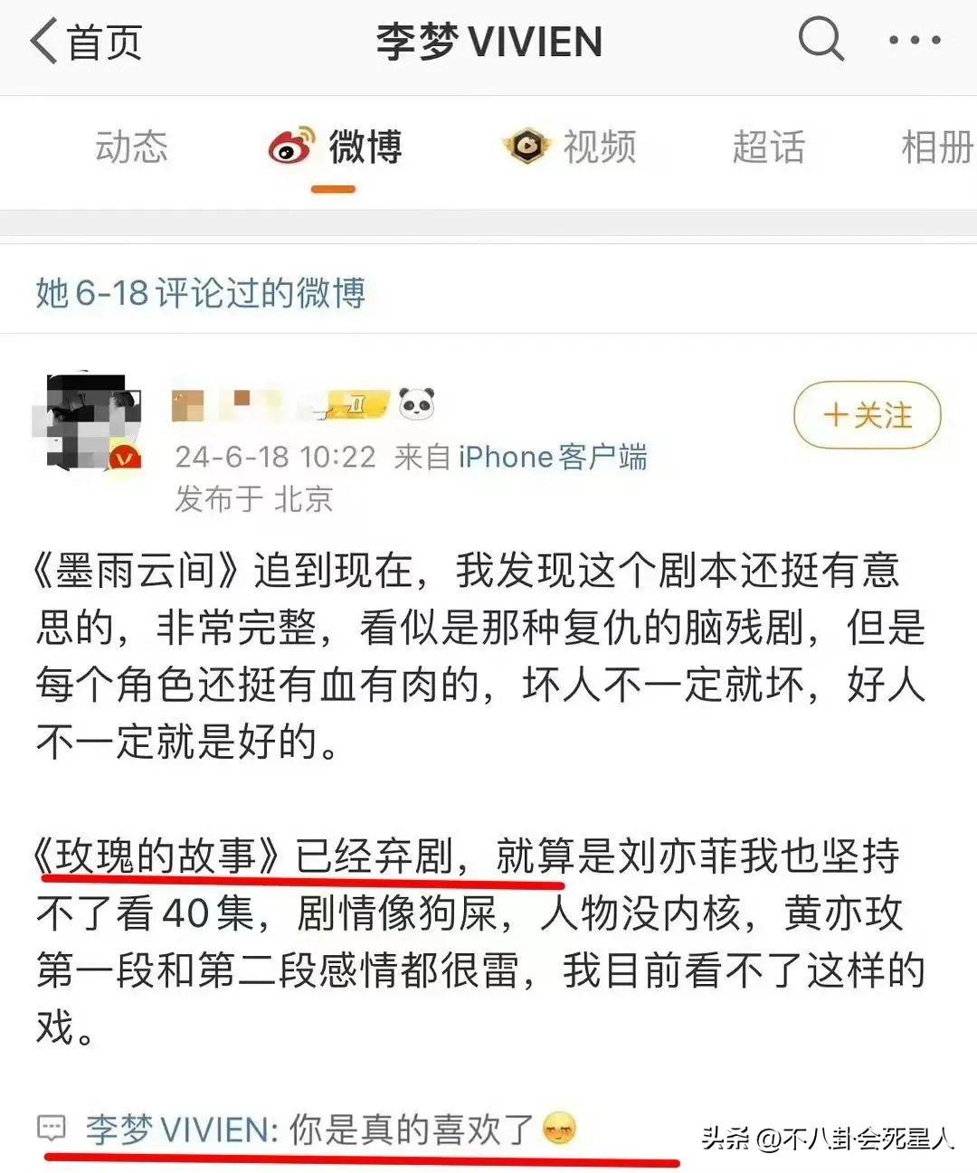 事情是這樣的,李夢出演的《墨雨雲間》正在熱播的時候,隔壁平臺有《玫瑰的故事》播出,有個帖子誇讚《墨雨雲間》好看,《玫瑰的故事》已經棄劇,就算是劉亦菲在也堅持不下去,李夢直接過來評論,“你是真的喜歡了”。