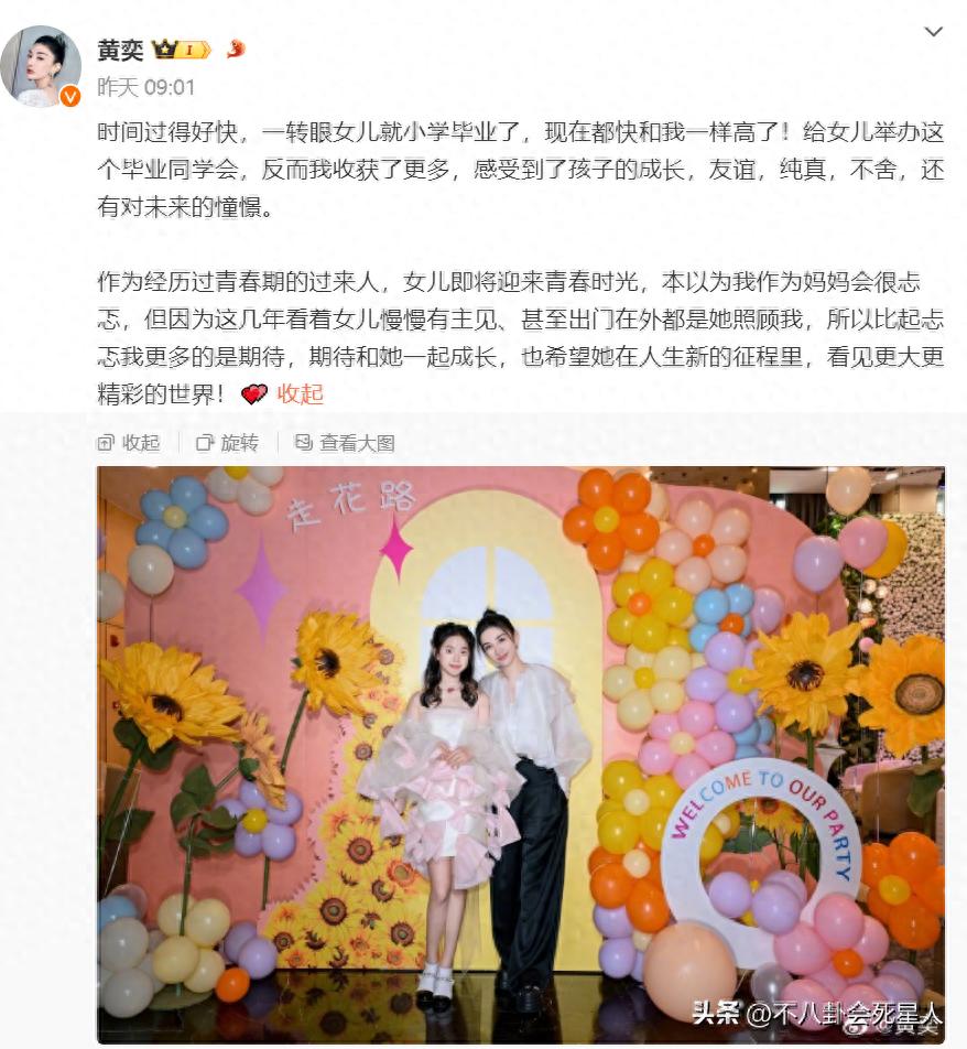 近日,黃奕在微博曬出女兒參加party的照片。這是她和前夫黃毅清生的女兒。不得不說時間過的真快啊,女兒都小學畢業了。