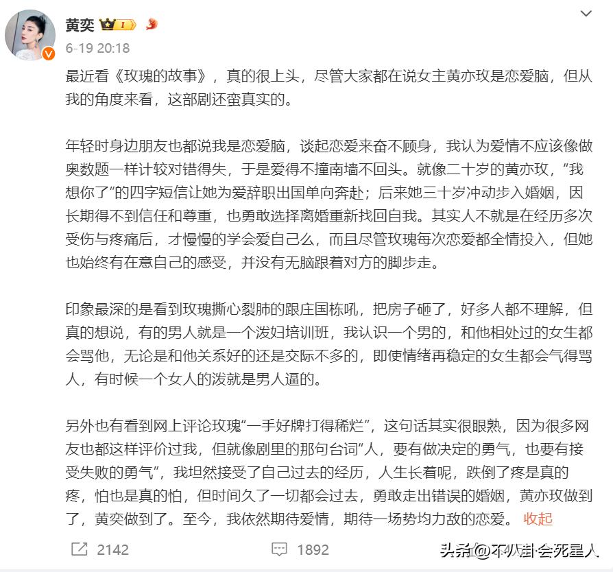 這陣子“天仙”劉亦菲主演的電視劇《玫瑰的故事》熱播,由劉亦菲飾演的黃亦玫與幾任男主角的感情經歷引發網友熱議。前幾天演員黃奕更是發微博長文,藉着電視劇抒發心中感慨,直言自己是個戀愛腦,一手好牌打的稀爛,也引發了網友熱議。