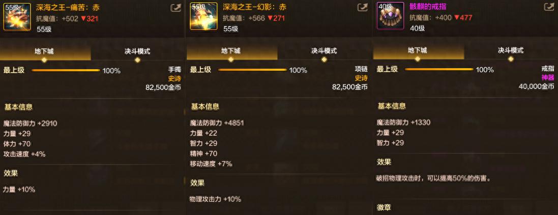 在湊齊深海3件套之前,深淵套裝或者塔套裝都只能算過渡選擇,沒必要爲了過渡裝備去更換屬強,當然土豪不一樣!