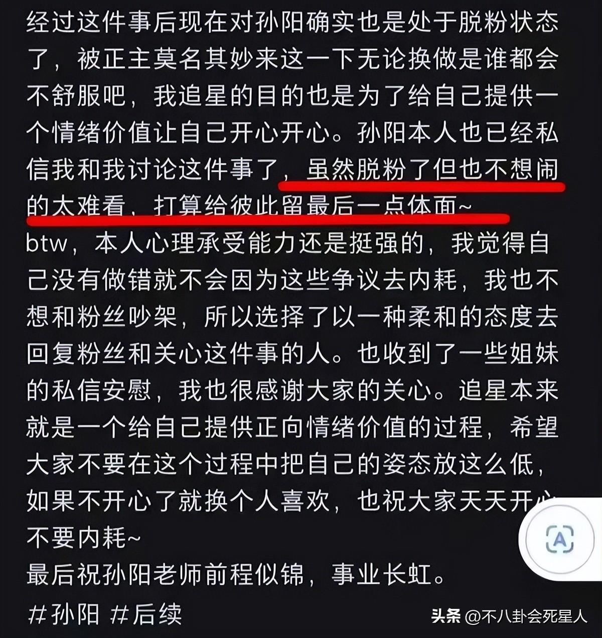 其實,這位粉絲是孫陽的老粉了,之前還去過他的路演,對於他的道歉,粉絲心情複雜,雖然脫粉也不想把事情鬧得太難看,打算給彼此留最後一點體面。