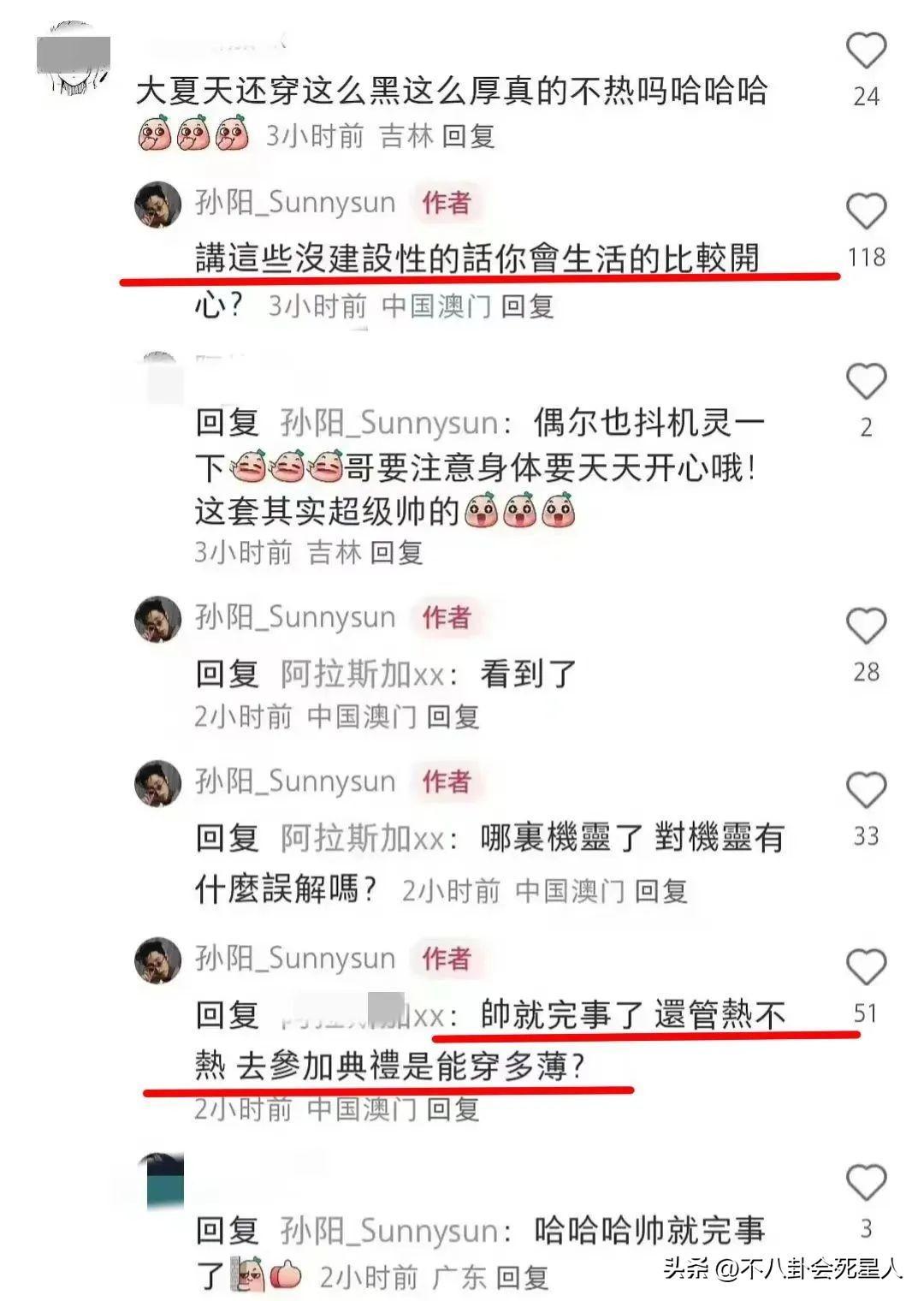 事情是這樣的,演員孫陽發了條動態,圖片中他穿着厚實的衣服。孫陽粉絲注意到現在天氣這麼熱,他還穿很多,擔心他會熱,於是好奇地問了一句“不熱嗎”。