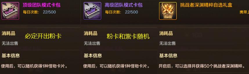 高級卡包就比較看運氣了,深淵精髓前期效果不明顯,每個月只能換一次50個精髓;