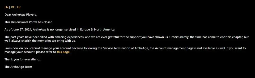 令愛德華和扎卡里結怨的遊戲是《上古世紀》(ArcheAge),一款韓國的奇幻MMORPG。就在今年4月,這個遊戲的官方發佈公告稱,由於活躍玩家數量下降,將在6月27日,也就是今天停止對歐洲和北美用戶提供服務。