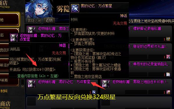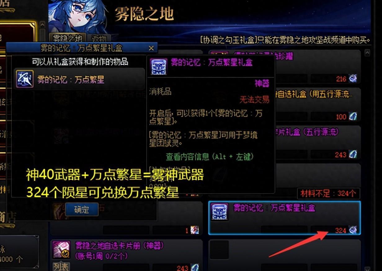 這裏的解決方法爲:打一次霧神團本,就可以獲得1個萬點繁星,而這個萬點繁星又可以在攻堅商店中返還成324個隕星!