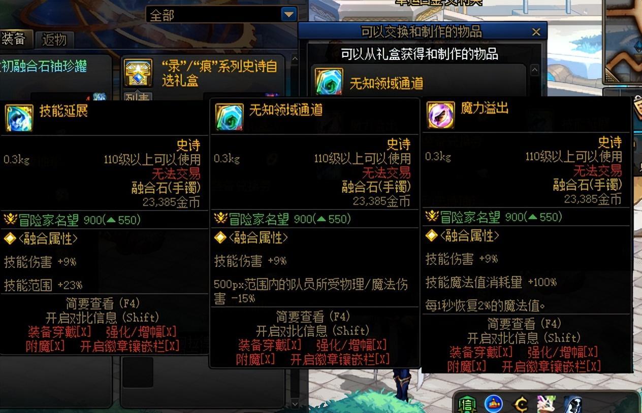 融合石有3件,基礎技攻都是一樣的,只有額外效果不相同,分別對應“減傷”“回藍”“範圍”。