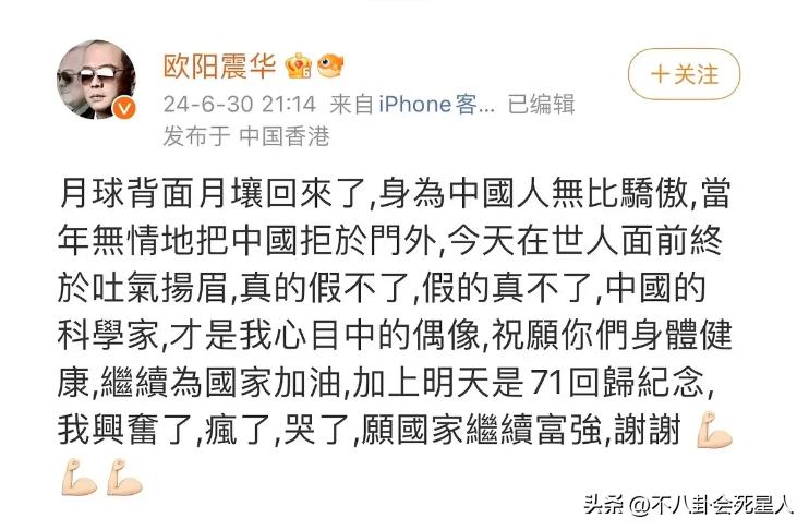 要說慶祝迴歸發佈的動態最爲感人的港圈明星,那一定是歐陽震華,在香港迴歸27週年的前一天,就寫了一大段文字,抒發情感。歐陽震華寫道最近祖國帶回了月球的土壤,他身爲中國人感到無比驕傲,還稱當年受到冷眼,如今終於揚眉吐氣,並大讚祖國的科學家纔是自己心目中的偶像。在微博的結尾,歐陽震華寫道:“明天是71迴歸幾百年,我興奮了、瘋了、哭了,願國家繼續富強。”