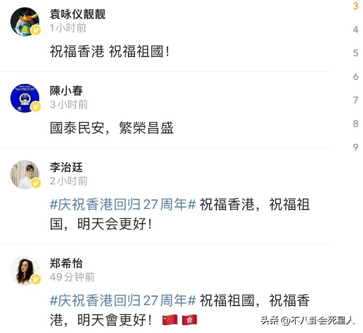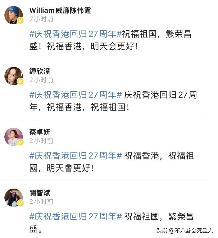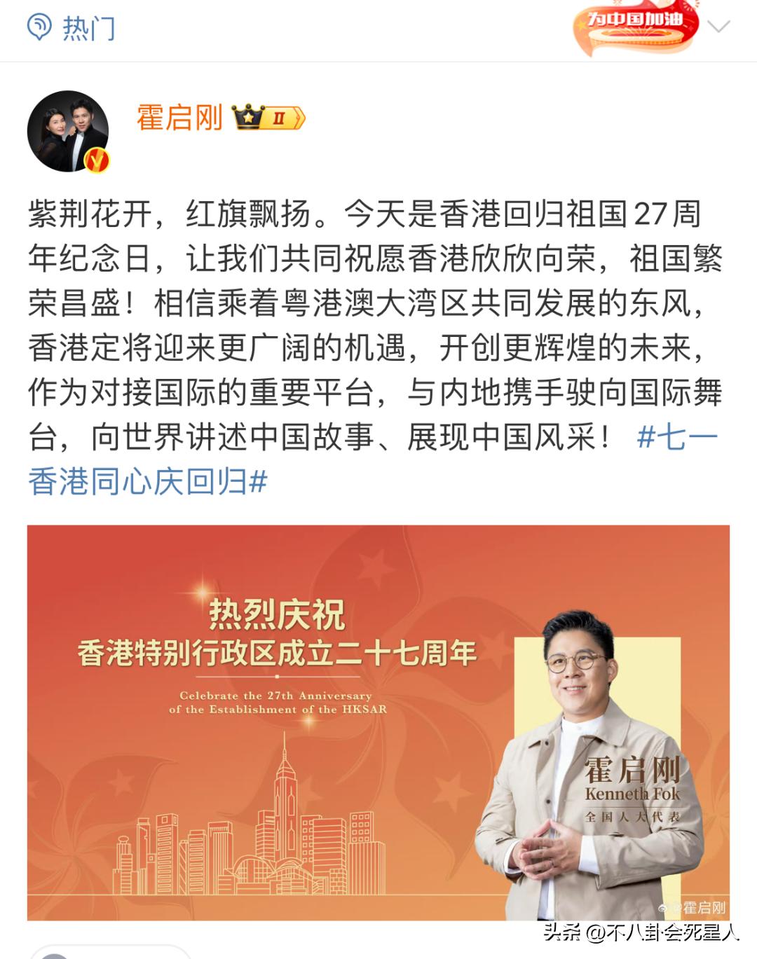 除了郭晶晶和霍啓剛夫婦,大家熟悉的陳小春、陳偉霆、鍾欣潼、蔡卓妍、容祖兒、關智斌、袁詠儀等港圈藝人都發布微博,並帶上了香港迴歸的話題詞條,慶祝香港迴歸。雖然這些明星只是簡單的文字,但也表明了自己的態度。