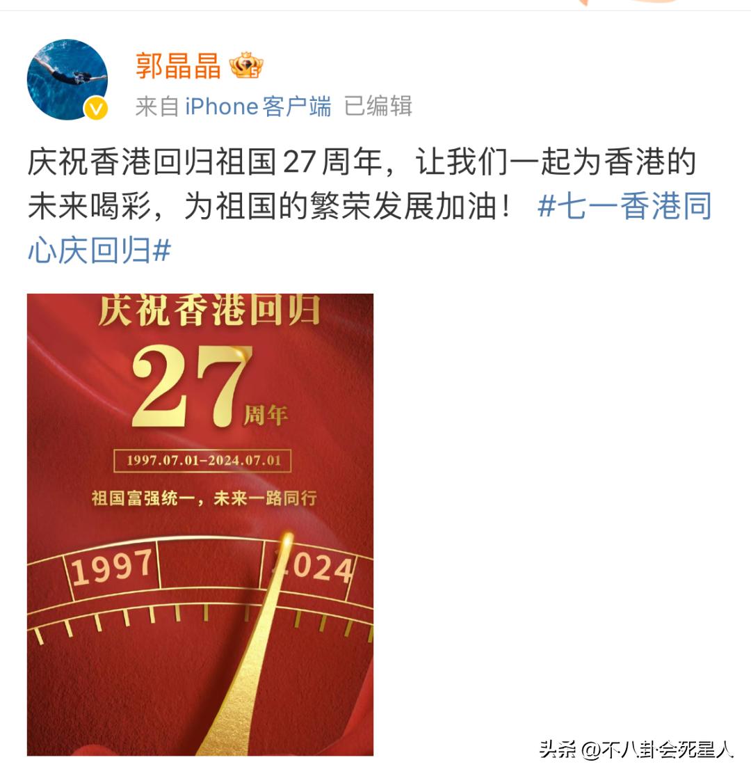 郭晶晶發文道:“慶祝香港迴歸祖國27週年,讓我們一起爲香港的未來喝彩,爲祖國的繁榮發展加油。”