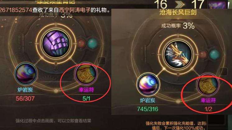 比如50級史詩武器,高等級強化只需要1張幸運符,而55級滄海武器,高等級強化就需要2張幸運符,長期積累下來,二者差距還是挺大的。