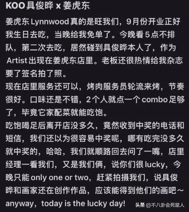 不僅如此,這家烤肉店主打一個性價比實惠,服務也不錯,有網友稱具俊曄時常去店裏幫忙,所以很多粉絲都跑去捧場。