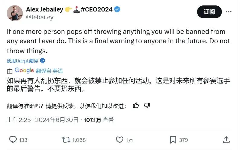 沒過多久,賽事主辦者Alex Jebailey在推特上發文詢問Dyloch選手的PayPal賬號,並表示應該有人站出來爲這臺被砸壞的照明設備買單。隨後Alex發佈了一篇正式聲明,警告參賽選手不要再隨手亂扔東西,因爲被Dyloch選手砸壞的那臺LED燈,是他們花了2992美元的高價買過來的。