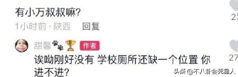 在網友故意提到“小萬叔叔”時,甜馨也會回覆,沒有,學校廁所還缺一個位置,你要去嗎?