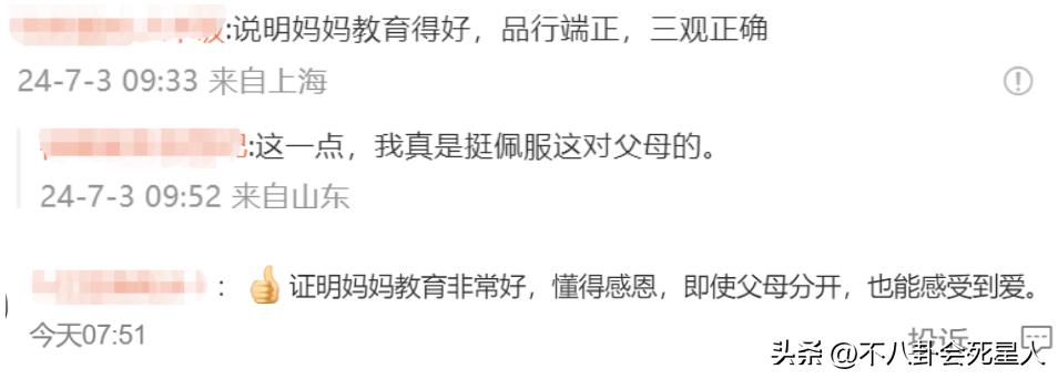 確實,正如有網友說的,不少父母離婚就會互相詆譭,甚至爲了自己讓孩子生活在父母彼此的仇恨恩怨中,讓孩子飽受折磨,而甜馨的成熟懂事和敢於面對質疑的性格,也離不開父母的教育和愛。