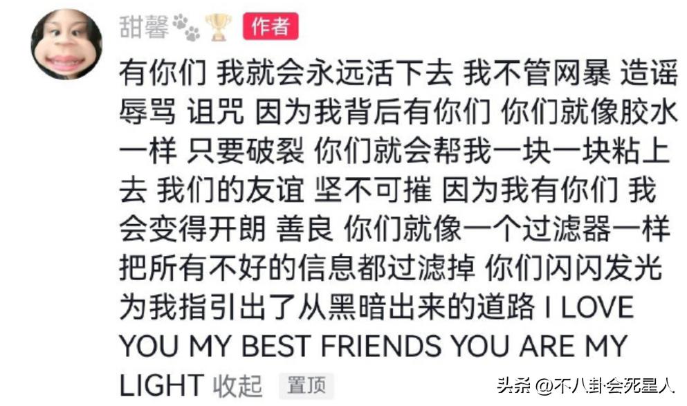而且年紀輕輕的甜馨也會發文感謝那些對自己帶有善意的網友,因爲她覺得那些支持她的網友就像“膠水”,能治癒那些讓她破裂的傷口。