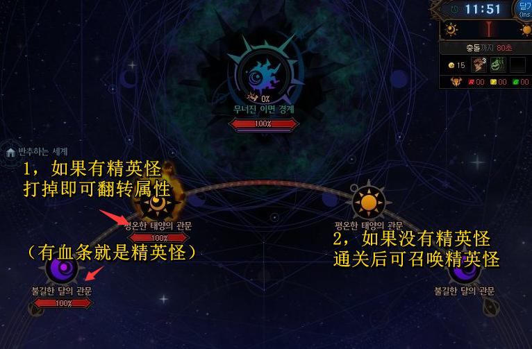 有2種方法調整區域屬性:第一種,如果該區域有精英怪(有血條的),打掉即可翻轉屬性,比如太陽變月亮、月亮變太陽;