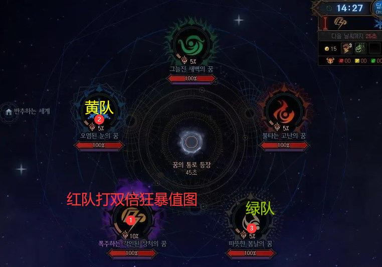 【4.推薦流程】首先讓紅隊進入“雙倍狂暴區域”,黃綠隊分別進入該區域的左右兩個圖(可以喫到紅隊的濺射傷害);